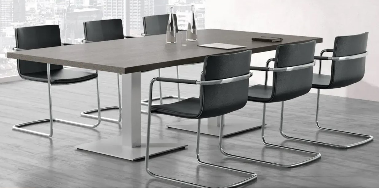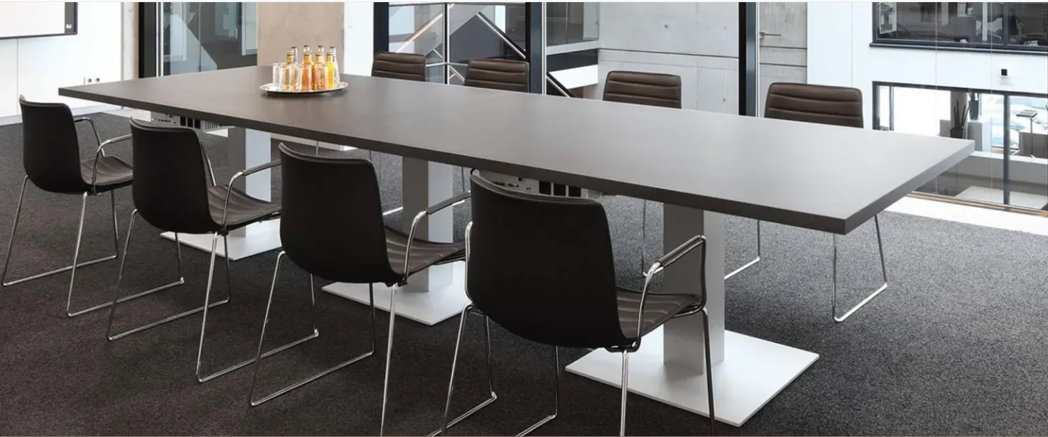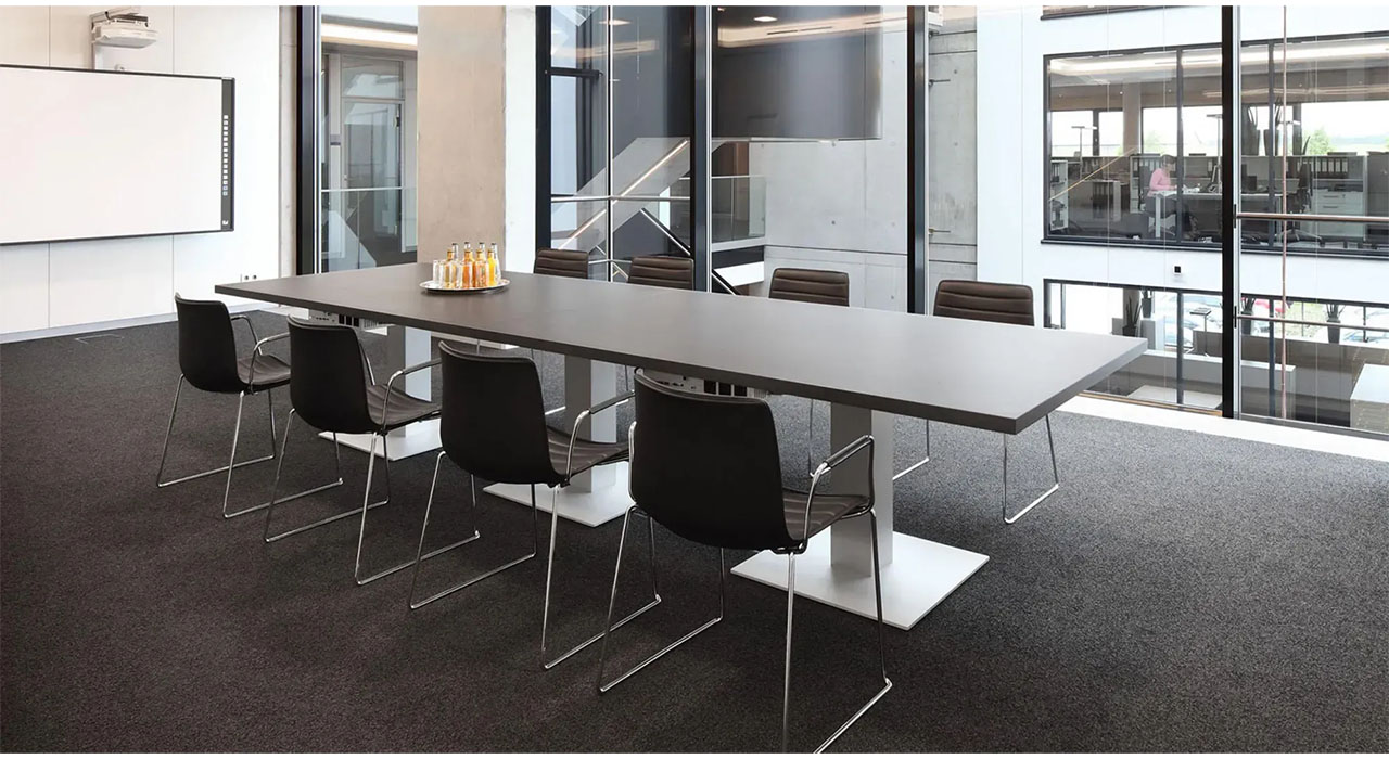 Η τράπεζα συμβουλίου Sono διαθέτει εντυπωσιακά πόδια αλουμινίου που υποστηρίζουν διαφορετικά μήκη επιφάνειας.
