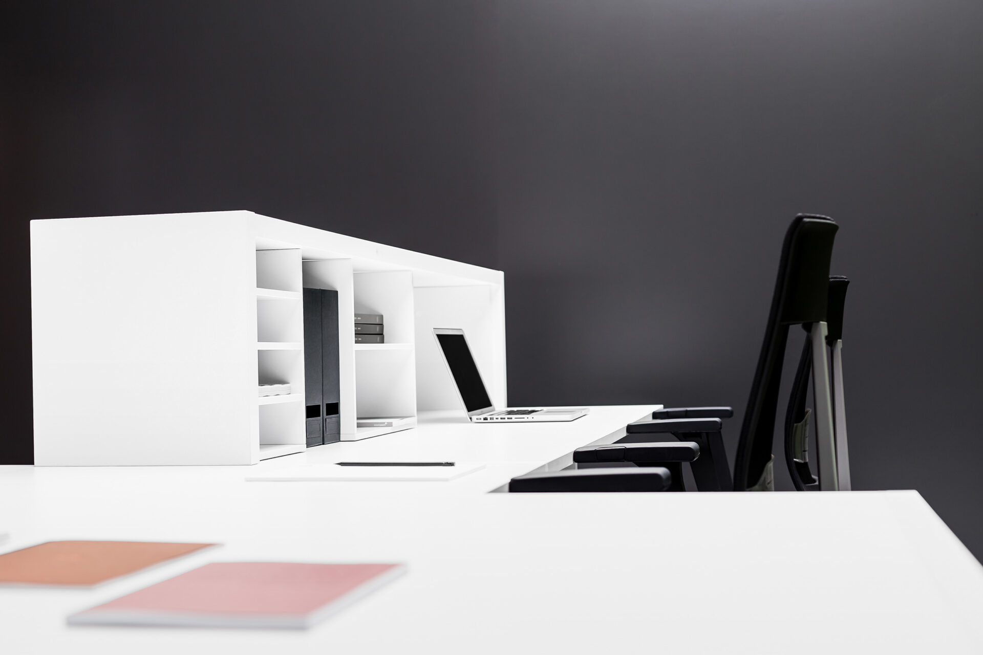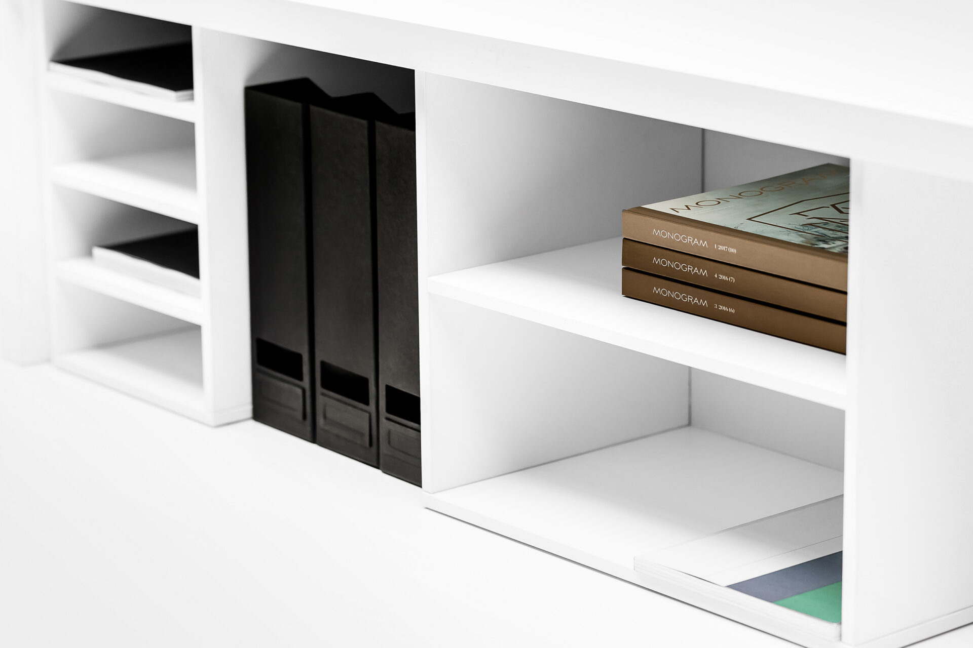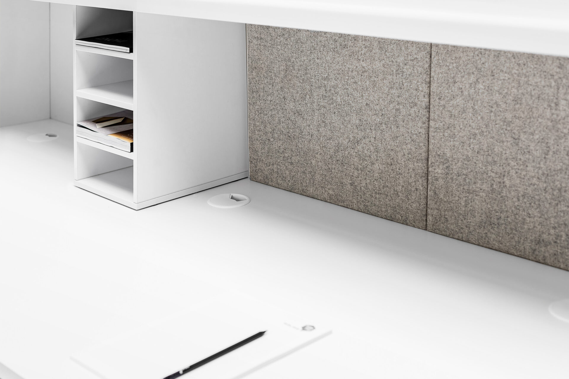 Τα στοιχεία εξοπλισμού στο εσωτερικό του πάγκου προσφέρουν πρόσθετη λειτουργικότητα: Τα κινητά ράφια για έγγραφα και οι πίνακες με επένδυση εξασφαλίζουν σαφή επισκόπηση και τάξη στο χώρο εργασίας. Η δυνατότητα εξόδων καλωδίων στους πάγκους εργασίας και η έξυπνη δρομολόγηση καλωδίων συμβάλλουν στην εκλεπτυσμένη λειτουργικότητα και εργονομία αυτού του επίπλου.