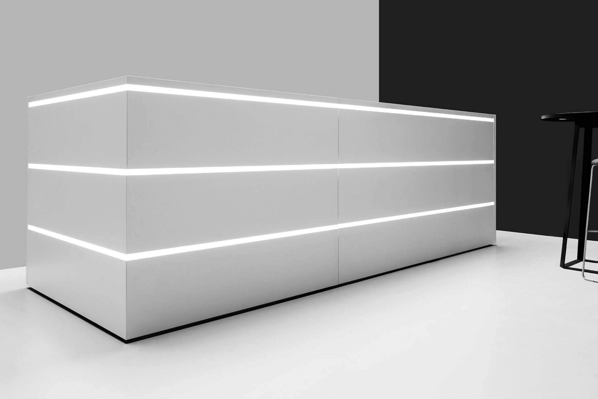 Οι μονάδες του συστήματος ρεσεψιόν TRESTA διατίθενται σε ευθείες και γωνιακές εκδόσεις καθώς και σε ψηλά ή χαμηλά στοιχεία. Τα πλαϊνά του πάγκου μπορούν να επιλεγούν από μια μεγάλη γκάμα και διατίθενται σε ευρεία, στενή, ψηλή ή χαμηλή έκδοση. Υπάρχει μεγάλη ποικιλία σχεδίων για να διαλέξετε για την πρόσοψη των πάγκων: από απλά πάνελ μελαμίνης έως φυσικό καπλαμά και ματ ή γυαλιστερές λακαρισμένες επιφάνειες έως διάφορες πλαστικοποιημένες επιφάνειες σε πολλά ελκυστικά χρώματα με γυαλιστερό φινίρισμα. Διαφορετικά χρώματα και τεχνολογίες μπορούν να συνδυαστούν για να επιτευχθεί μια εξατομικευμένη εμφάνιση.